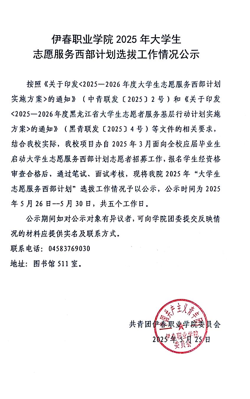 伊春職業(yè)學(xué)院2025年大學(xué)生志愿服務(wù)西部計(jì)劃選拔工作情況公示