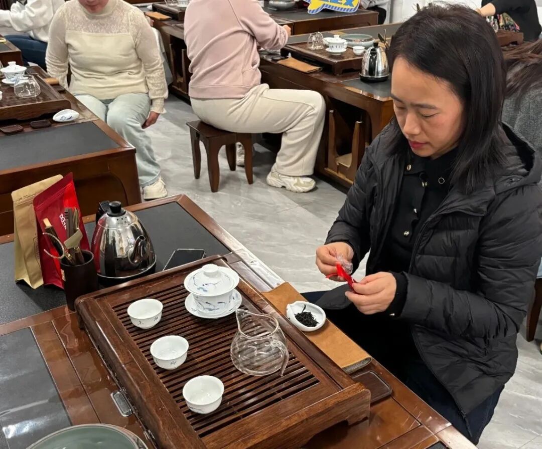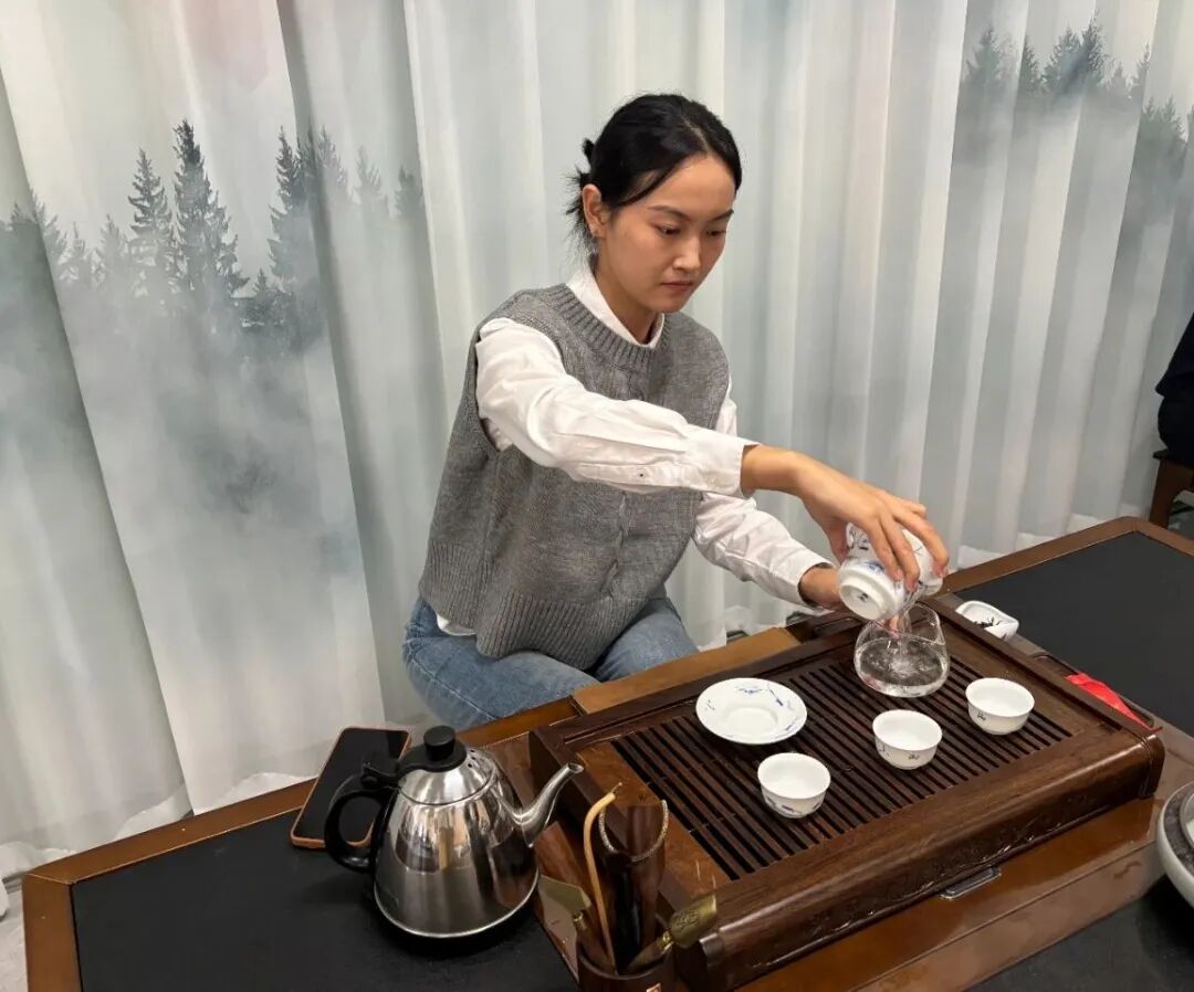 本期課程由我校旅游商務(wù)學(xué)院王廷老師擔(dān)任主講。課程圍繞“識(shí)茶、習(xí)藝、品茗、修身”四大模塊展開,王廷老師帶領(lǐng)學(xué)員系統(tǒng)了解茶葉從采摘到制作的工藝過(guò)程,細(xì)致講解不同茶類的特點(diǎn)與沖泡要領(lǐng)。在實(shí)踐環(huán)節(jié)中,學(xué)員們親手操作蓋碗、品茗杯等茶具,學(xué)習(xí)控制水溫、注水節(jié)奏與出湯時(shí)間,體驗(yàn)從溫具到奉茶的完整流程。整個(gè)教學(xué)過(guò)程中,學(xué)員們或凝神聆聽,或?qū)W?shí)踐,在王廷老師的悉心指導(dǎo)下漸入佳境。茶香裊裊中,大家靜心品茗、交流感悟,在傳統(tǒng)茶道禮儀中修養(yǎng)心性、結(jié)識(shí)知己,營(yíng)造出寧?kù)o而融洽的學(xué)習(xí)氛圍。
