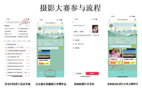 抖音掃碼進入活動頁面→點擊報名拍攝提交參賽作品→添加標題公開發(fā)布→邀請好友助力。