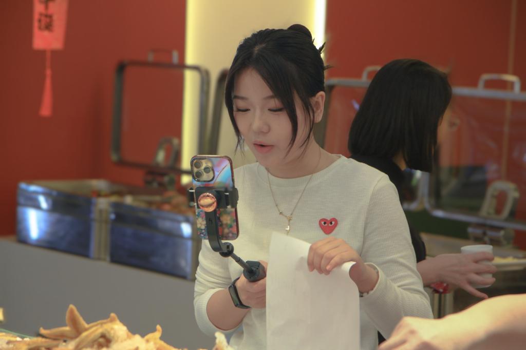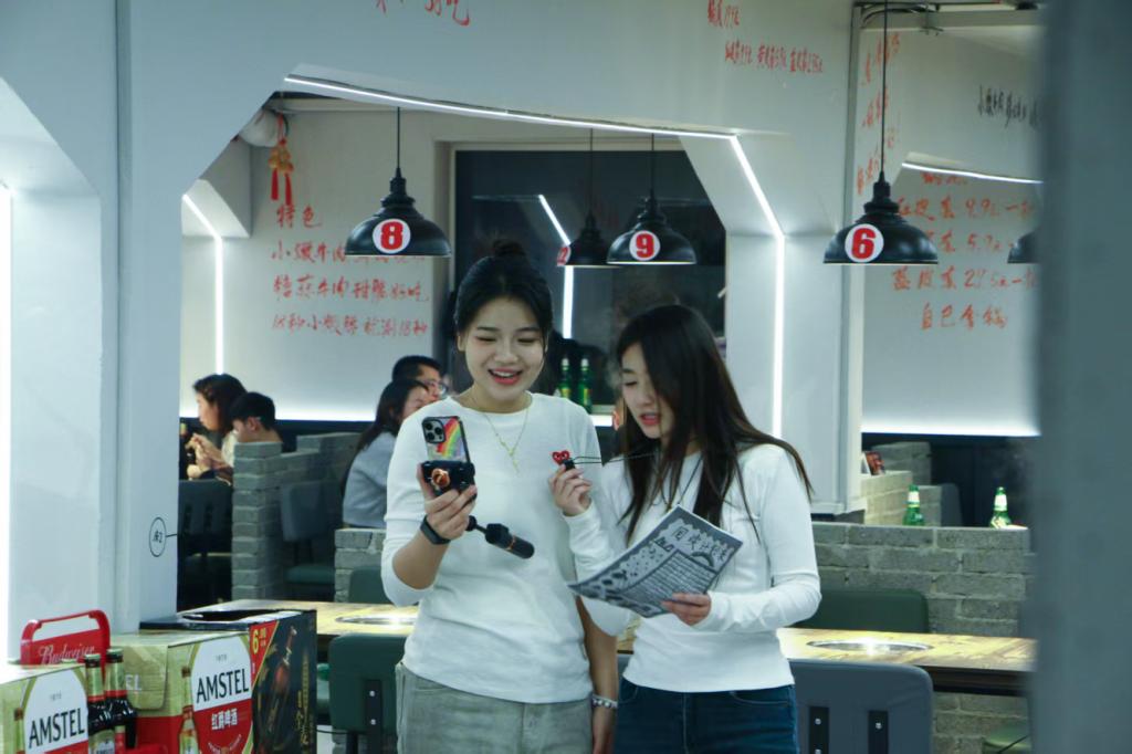 同學(xué)們午間場在玖和盛海鮮自助開啟直播,生動展示菜品特色精準解讀優(yōu)惠權(quán)益,向直播間里的粉絲們推介店家的特色代金券,點燃了在線粉絲的消費熱情;晚間場轉(zhuǎn)戰(zhàn)老川蜀涮串,針對市井消費場景靈活調(diào)整話術(shù),突出“串串香”性價比與社交屬性。從自助餐到特色涮串,兩種不同的品類與消費場景,對學(xué)生的話術(shù)調(diào)整和現(xiàn)場應(yīng)變能力提出了更高要求。