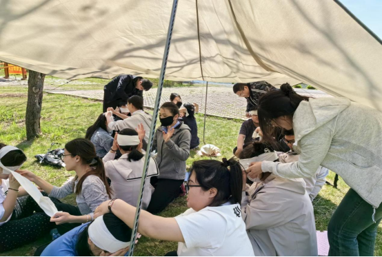 實訓(xùn)課上,王老師圍繞課程本身從戶外旅游行業(yè)發(fā)展實際情況出發(fā),組織大家利用登山杖構(gòu)建娛樂游戲“不倒森林”。