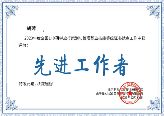 我校作為全國首批獲得“1+X”研學(xué)旅行策劃與管理(EEPM)職業(yè)技能等級證書的考點院校之一,被親子貓北京國際教育科技有限公司授予2023年度“1+X”研學(xué)EEPM證書試點院校。旅游商務(wù)學(xué)院胡萍老師被授予“2023年度全國1+X研學(xué)策劃與管理職業(yè)技能等級證書考試工作先進工作者”。本次認(rèn)證考試全面評估了學(xué)生在研學(xué)旅行策劃與組織方面的理論知識和實際操作能力,有效提升了學(xué)生的實踐技能。