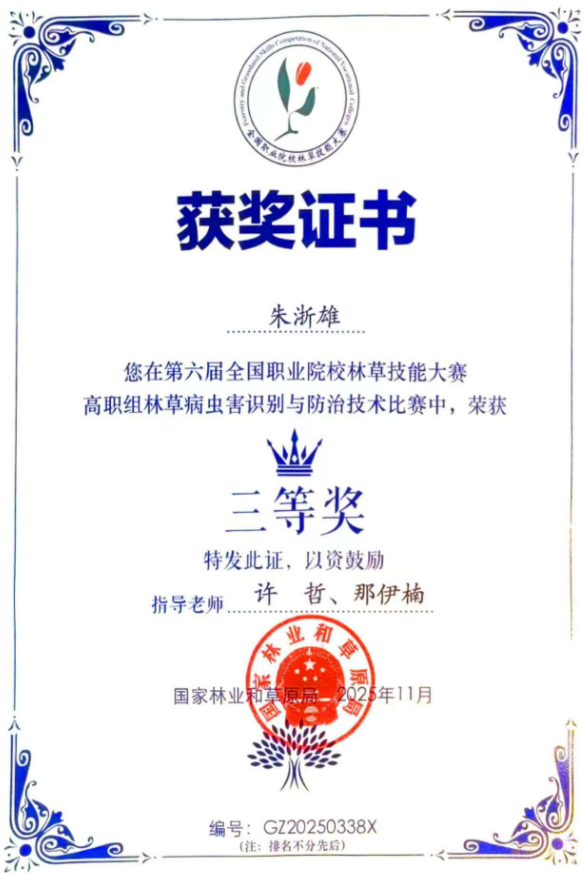 校領導對此次大賽高度重視,將其作為檢驗教學成果、錘煉學生技能、深化產教融合的重要契機。賽前,工程應用技術學院精心部署備戰(zhàn)工作,從選手選拔、師資配備到訓練方案制定均進行了系統(tǒng)規(guī)劃。此次我校共選派3支代表隊,分別征戰(zhàn)碳匯調查技術、林草病蟲害識別與防治、林草無人機應用技術三個賽項。最終,2024級林業(yè)技術學生朱浙雄獲得林草病蟲害識別與防治技術三等獎,2024級林業(yè)技術學生黃家偉和蔣家奇獲得林草無人機應用技術三等獎。