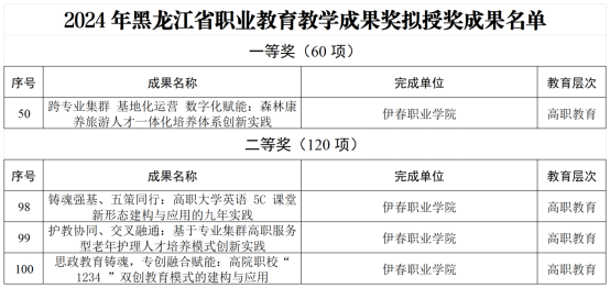 近日,黑龍江省教育廳發(fā)布了《關(guān)于2024年黑龍江省高等教育(本科、研究生)和職業(yè)教育教學(xué)成果獎(jiǎng)擬授獎(jiǎng)成果的公示》。經(jīng)單位申報(bào)、專家評(píng)審、教學(xué)成果獎(jiǎng)評(píng)審委員會(huì)審議,我校喜獲職業(yè)教育教學(xué)成果一等獎(jiǎng)1項(xiàng),二等獎(jiǎng)3項(xiàng)。其中,《跨專業(yè)集群 基地化運(yùn)營 數(shù)字化賦能:森林康養(yǎng)旅游人才一體化培養(yǎng)體系創(chuàng)新實(shí)踐》榮獲一等獎(jiǎng);《思政教育鑄魂,專創(chuàng)融合賦能:高院職校“1234”雙創(chuàng)教育模式的建構(gòu)與應(yīng)用》《護(hù)教協(xié)同、交叉融通:基于專業(yè)集群高職服務(wù)型老年護(hù)理人才培養(yǎng)模式創(chuàng)新實(shí)踐》《鑄魂強(qiáng)基、五策同行:高職大學(xué)英語5C課堂新形態(tài)建構(gòu)與應(yīng)用的九年實(shí)踐》榮獲二等獎(jiǎng)。