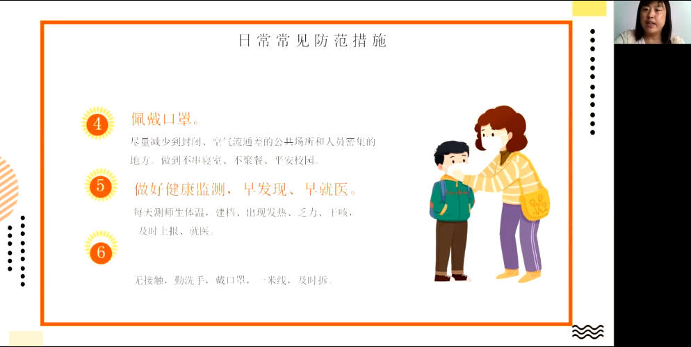 本次講座主要培訓(xùn)新型冠狀病毒肺炎防控方案(第九版)及高等學(xué)校新冠肺炎疫情防控技術(shù)(第六版)相關(guān)內(nèi)容。從第九版疫情防控校園管理新增內(nèi)容、師生常見防范措施、校園疫情防控、日常疫情的應(yīng)急處置、疫情期間心理健康等方面進(jìn)行培訓(xùn)。