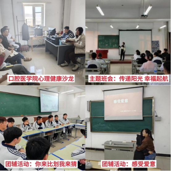 口腔醫(yī)學院依托“5·25心理健康宣傳月”開展了以“傳遞陽光 幸福啟航”為主題的系列活動,心理健康沙龍、團輔活動“你來比劃我來猜、感受愛意、了解珍貴的自己”、主題班會?;顒映浞志哿熒献?、家校共育,不斷創(chuàng)新和深化心育形式,引導(dǎo)廣大學生積極關(guān)注心理健康、表達心里感受,營造了“人人關(guān)注心理健康、助人自助攜手成長”的心理健康教育氛圍,培育了學生自尊、自信、自愛、陽光積極向上的健康心態(tài)。
