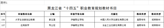 近日,黑龍江省教育廳印發(fā)了《關(guān)于公布黑龍江省“十四五”職業(yè)教育規(guī)劃教材名單的通知》,我校韋立宏主編的《應(yīng)用數(shù)學(xué)》和郭玉蓮主編的《大學(xué)生創(chuàng)新創(chuàng)業(yè)教育》兩本教材入選黑龍江省“十四五”職業(yè)教育省級規(guī)劃教材。