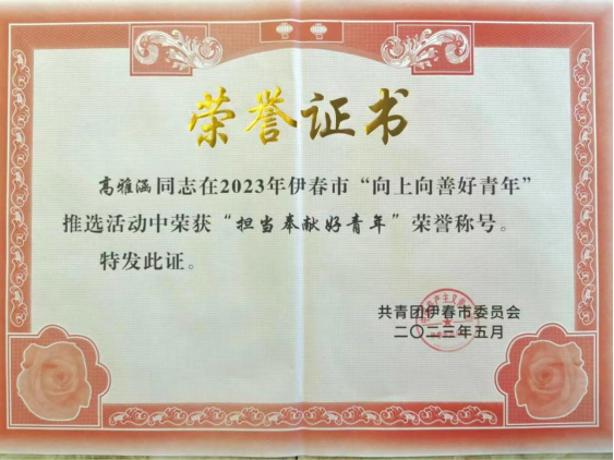 師范學(xué)院輔導(dǎo)員高雅涵榮獲2023年伊春市“擔(dān)當(dāng)奉獻好青年”榮譽稱號。