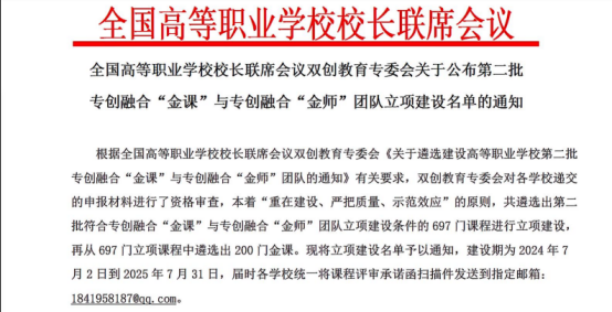 近日,全國高等職業(yè)學(xué)校校長聯(lián)席會議雙創(chuàng)教育專委會公布了第二批專創(chuàng)融合“金課”與專創(chuàng)融合“金師”團隊立項建設(shè)名單,根據(jù)全國高等職業(yè)學(xué)校校長聯(lián)席會議雙創(chuàng)教育專委會《關(guān)于遴選建設(shè)高等職業(yè)學(xué)校第二批專創(chuàng)融合“金課”與專創(chuàng)融合“金師”團隊的通知》有關(guān)要求,經(jīng)評審遴選,我校高教研究室推薦申報的《視頻編輯制作》《老年護理》《大學(xué)生創(chuàng)新創(chuàng)業(yè)教育》等3門課程全部被確定為全國高等職業(yè)學(xué)校校長聯(lián)席會議雙創(chuàng)教育專委會第二批專創(chuàng)融合“金課”與專創(chuàng)融合“金師”團隊項目立項建設(shè)。