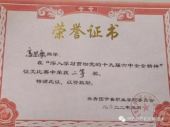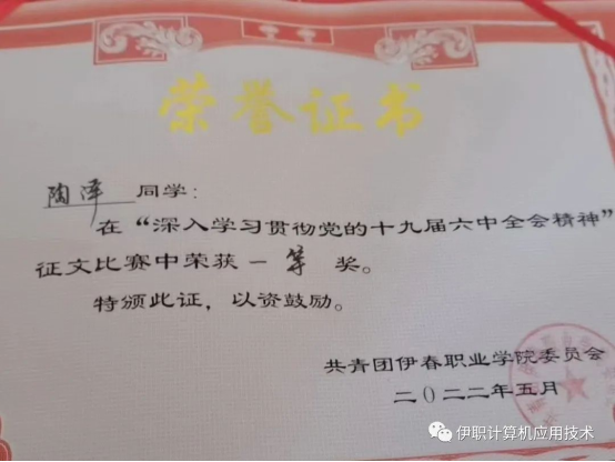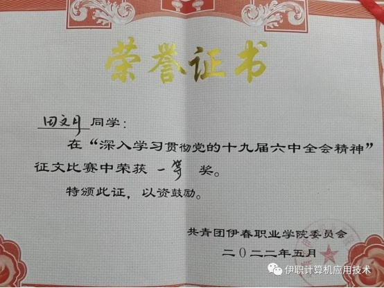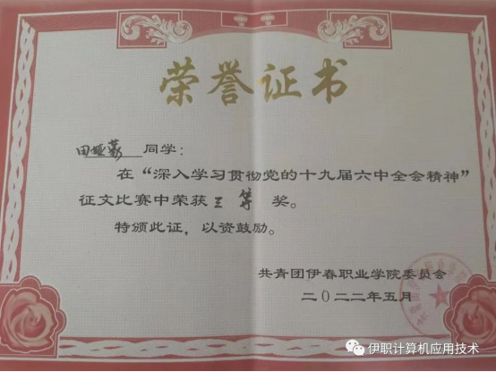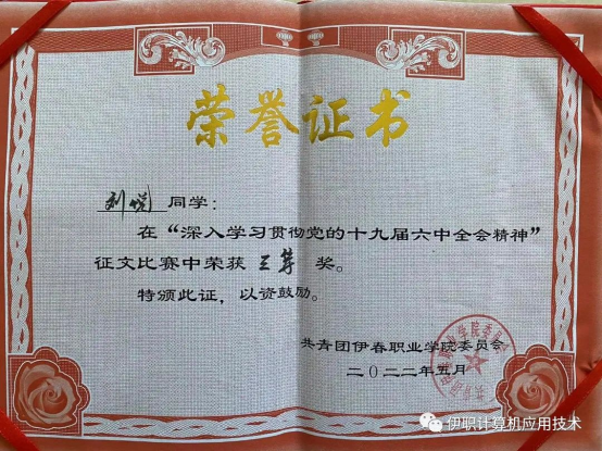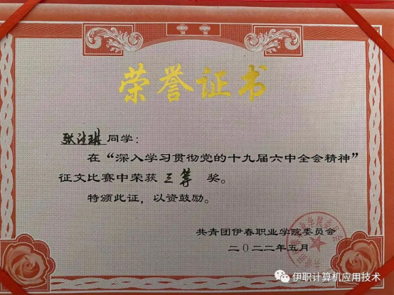 為深入開展黨史學(xué)習(xí)教育,認(rèn)真學(xué)習(xí)宣傳貫徹黨的十九屆六中全會(huì)精神,深刻領(lǐng)會(huì)黨的百年奮斗重大成就和歷史經(jīng)驗(yàn)。積極號(hào)召同學(xué)們不忘初心、牢記使命,做一名有為的新時(shí)代青年,為實(shí)現(xiàn)中華民族偉大復(fù)興不懈奮斗。校團(tuán)委圍繞全會(huì)精神和中國共產(chǎn)黨的百年奮斗歷程進(jìn)行熱烈的學(xué)習(xí)和交流,舉辦“深入學(xué)習(xí)貫徹黨的十九屆六中全會(huì)精神”征文比賽,計(jì)算機(jī)應(yīng)用技術(shù)學(xué)院學(xué)生積極參與,在此次征文比賽中取得十分優(yōu)異的成績!