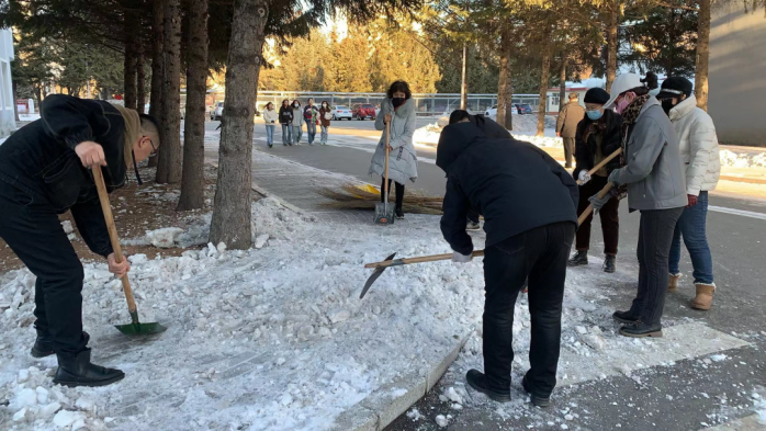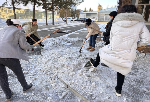 “崗位學(xué)雷鋒,服務(wù)樹(shù)新風(fēng)”。為保障學(xué)生返校后的出行安全,我院全體師生成立志愿服務(wù)隊(duì)不畏困難、齊心協(xié)力,利用鐵鍬、掃帚等工具,經(jīng)過(guò)一個(gè)多小時(shí)的奮戰(zhàn),將主要路段的積雪清除干凈,房檐冰掛地帶拉上警戒線,確保了行人行車的安全暢通。