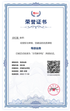 伊春職業(yè)學(xué)院旅游商務(wù)學(xué)院邱紅磊老師制作的線上課程《導(dǎo)游業(yè)務(wù)》因教學(xué)內(nèi)容豐富、課程體系合理、講解條理清楚、學(xué)習(xí)資料完整,經(jīng)超星公司組織專家評審,被超星平臺專家評為優(yōu)質(zhì)課程,正式收錄于超星“示范教學(xué)包”。