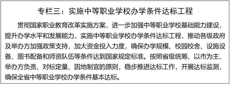3.夯實(shí)中等職業(yè)教育基礎(chǔ)地位。實(shí)施中等職業(yè)學(xué)校辦學(xué)條件達(dá)標(biāo)工程,加大資金投入力度,確保辦學(xué)條件基本達(dá)標(biāo)。實(shí)施“雙優(yōu)”建設(shè)計(jì)劃,培育建設(shè)一批優(yōu)質(zhì)中等職業(yè)學(xué)校和專業(yè)(群),打造龍江中等職業(yè)教育標(biāo)桿。圍繞區(qū)域經(jīng)濟(jì)社會發(fā)展需求,采取合并、合作、托管、集團(tuán)化辦學(xué)等形式,推動中等職業(yè)學(xué)校資源整合,鞏固“一縣一所”“一校一品”辦學(xué)格局。拓展中等職業(yè)學(xué)校技能培訓(xùn)、社區(qū)教育、老年教育職能,探索建立高水平高等職業(yè)學(xué)校與中等職業(yè)學(xué)校“大手拉小手”結(jié)對發(fā)展機(jī)制。支持“雙優(yōu)”學(xué)校開展五年一貫制培養(yǎng)試點(diǎn)。