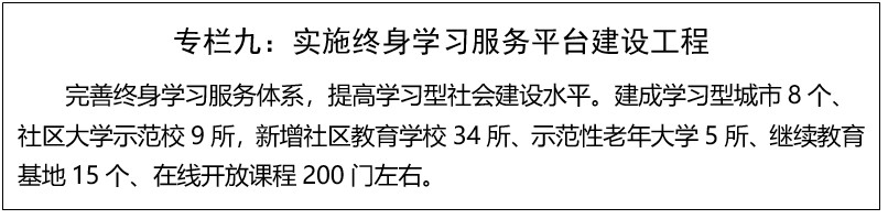 3.完善終身學(xué)習(xí)服務(wù)平臺。大力發(fā)展非學(xué)歷繼續(xù)教育,建成開放共享的終身學(xué)習(xí)網(wǎng)絡(luò)平臺,開發(fā)一批在線開放課程。鼓勵普通高校和職業(yè)學(xué)校面向現(xiàn)(退)役軍人、進(jìn)城務(wù)工人員、轉(zhuǎn)崗人員等社會群體,提供多樣化的教育與培訓(xùn)服務(wù),提高受教育者終身學(xué)習(xí)能力、就業(yè)創(chuàng)業(yè)能力。鼓勵有條件的職業(yè)學(xué)校舉辦社區(qū)學(xué)院。建立健全社區(qū)教育辦學(xué)網(wǎng)絡(luò),加快發(fā)展面向鄉(xiāng)村的社區(qū)教育。積極開發(fā)老年教育資源,支持老年大學(xué)建設(shè)。推動各類學(xué)習(xí)型組織建設(shè),建成一批學(xué)習(xí)型城市、學(xué)習(xí)型企業(yè)等,提高學(xué)習(xí)型社會建設(shè)水平。