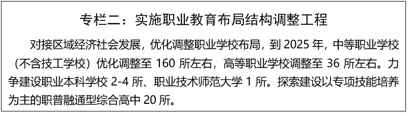 布局結(jié)構(gòu)持續(xù)優(yōu)化。以中等職業(yè)學(xué)校為重點(diǎn)推動資源整合,中等職業(yè)學(xué)校(不含技工校)從242所縮減到210所,基本形成了“一縣一所”“一校一品”的辦學(xué)格局。以高等職業(yè)學(xué)校為重點(diǎn),開展人才培養(yǎng)戰(zhàn)略定位及專業(yè)結(jié)構(gòu)優(yōu)化調(diào)整“雙論證”,形成了250個緊密對接區(qū)域產(chǎn)業(yè)發(fā)展需求的專業(yè)集群,促進(jìn)了高等職業(yè)學(xué)校特色發(fā)展。
