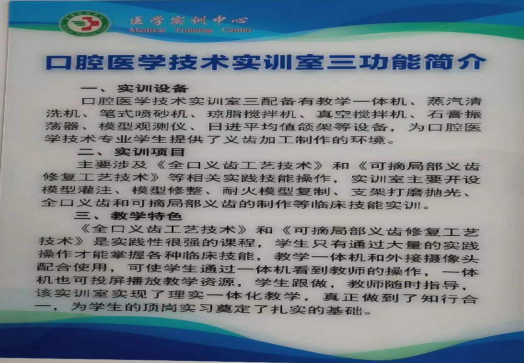 口腔醫(yī)學(xué)技術(shù)實(shí)訓(xùn)室配有有教學(xué)一體機(jī)、蒸汽清洗機(jī)、筆式噴砂機(jī)、瓊脂攪拌機(jī)、真空攪拌機(jī)、石膏振蕩器、模型觀測(cè)儀、日進(jìn)平均值頜架等設(shè)備,為口腔醫(yī)學(xué)技術(shù)專業(yè)學(xué)生提供了義齒加工制作的環(huán)境。