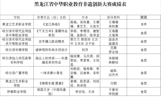 首屆黑龍江省中華職業(yè)教育非遺創(chuàng)新大賽共有20所院校、82個(gè)項(xiàng)目、391名師生參加現(xiàn)場決賽,分為工藝美術(shù)組和演藝組兩組進(jìn)行評比,參賽團(tuán)隊(duì)按照賽場分區(qū)搭建展臺,評審專家根據(jù)現(xiàn)場觀摩和座談評議情況進(jìn)行打分。最終,8個(gè)項(xiàng)目榮獲金獎、16個(gè)項(xiàng)目獲銀獎、20個(gè)項(xiàng)目獲銅獎。