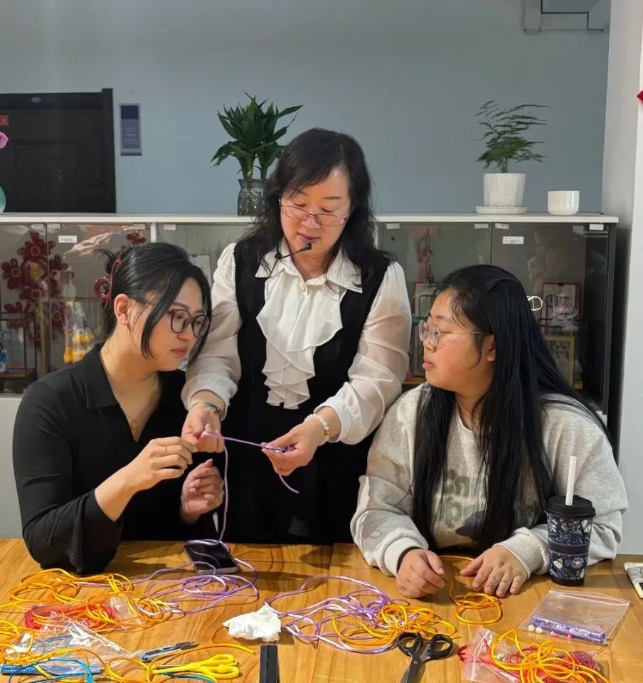 動(dòng)手實(shí)踐環(huán)節(jié),于老師邊演示邊指導(dǎo),不時(shí)俯身為學(xué)員們調(diào)整手勢(shì),細(xì)心為學(xué)員們答疑解惑,并鼓勵(lì)大家要勇于創(chuàng)新,嘗試非傳統(tǒng)的色彩組合,讓千年繩藝綻放青春光芒。